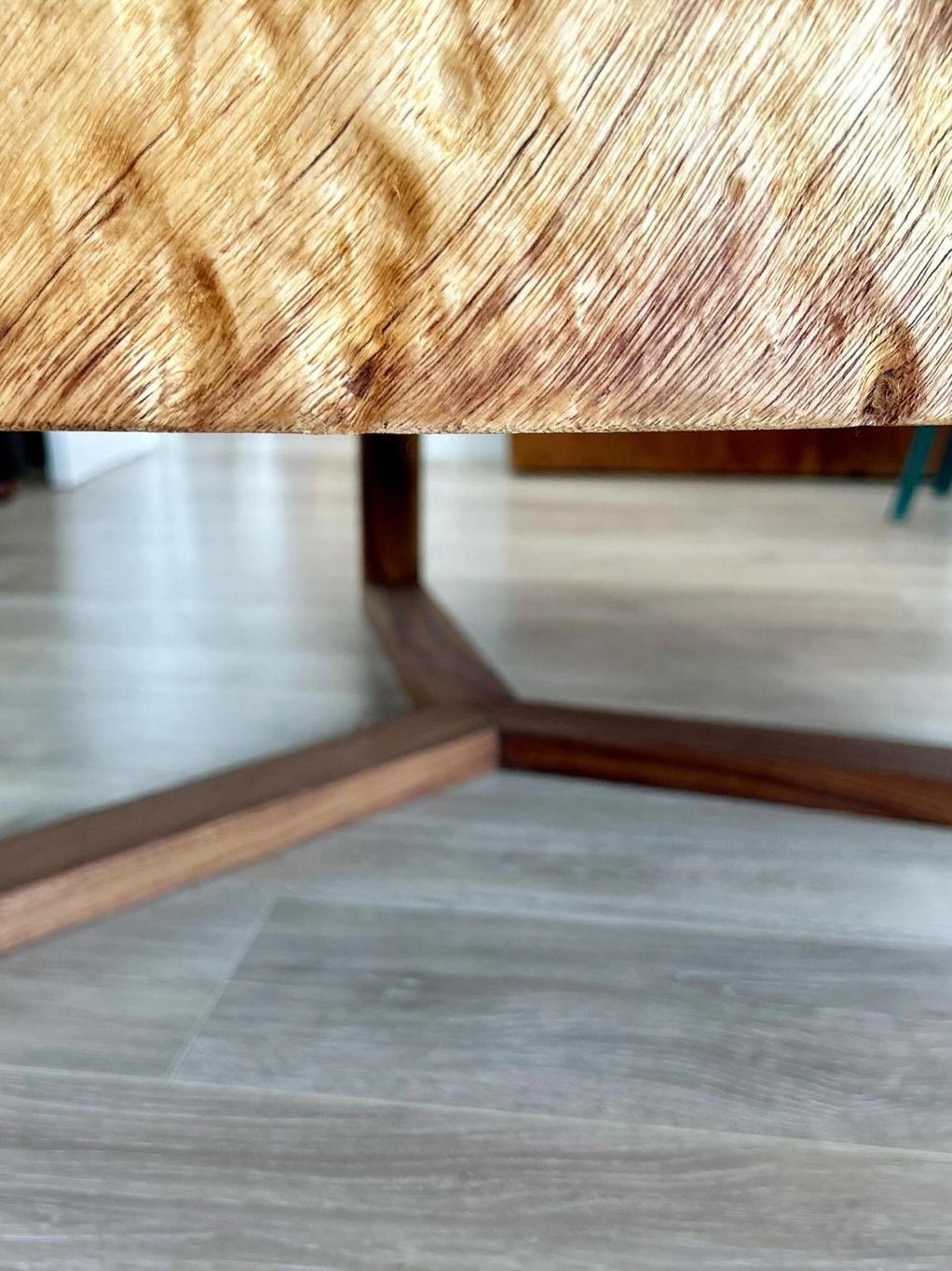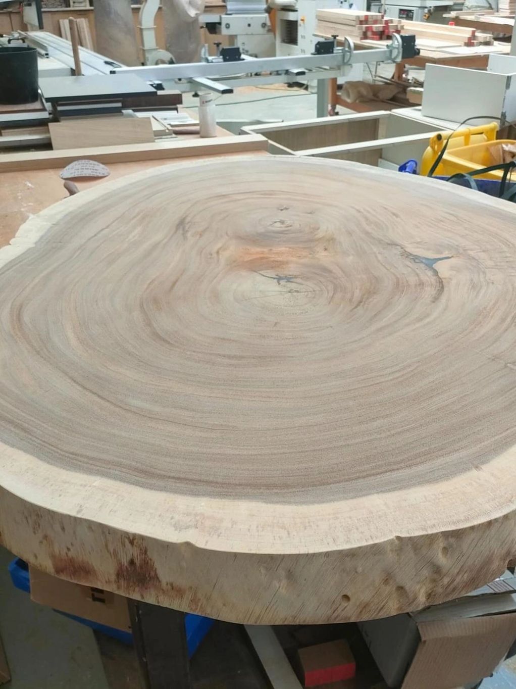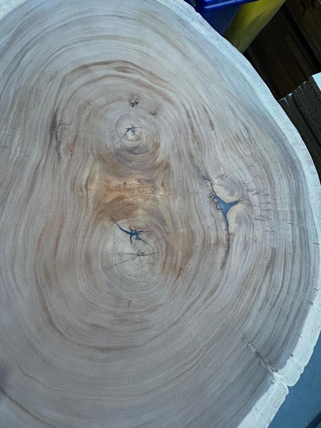 Esta rodaja tiene algo poco común: no una, sino dos médulas. Sí, dos centros de crecimiento dentro del mismo tronco 🌱🌱. Un fenómeno natural que da lugar a vetas concéntricas dobles y a este patrón tan bonito 😍.